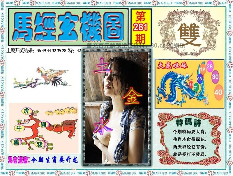 282期:马经玄机: 馬會透密:单数合双组一码 必中五肖:鼠牛猴鸡虎 必中三肖:鼠牛猴 必中一肖:鼠 |